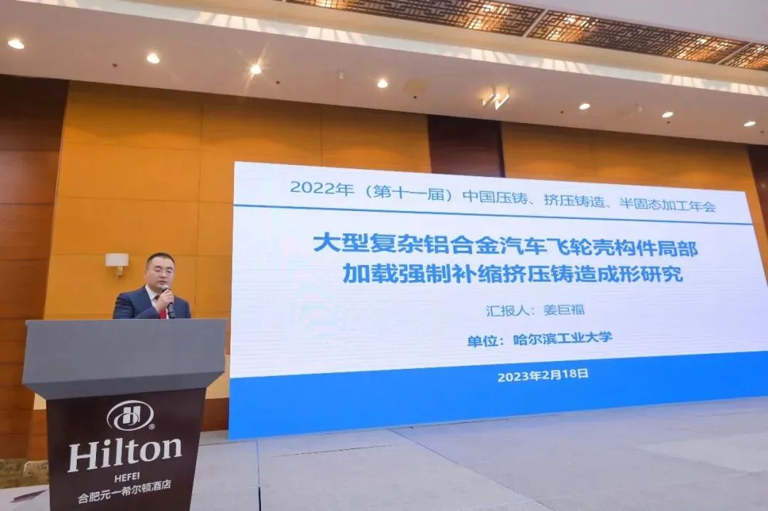 哈爾濱工業(yè)大學(xué)姜巨福教授以《大型復(fù)雜鋁合金汽車飛輪殼構(gòu)件局部加載強(qiáng)制補(bǔ)縮擠壓鑄造成形研究》為題作報(bào)告