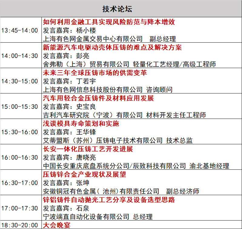 亮點介紹 論壇的首要亮點是聚焦壓鑄產業熱點議題 十一篇專題報告以及一項圓桌論壇研討,此次會議更設有企業參觀環節。演講嘉賓來自壓鑄行業內的知名企業,邀請到中國電動汽車百人會 副秘書長師建華為大家講解新時代背景下中國新能源汽車發展之路。中國汽車流通協會汽車市場研究分會秘書長崔東樹為大家帶來了汽車三電系統未來發展趨勢。舍弗勒(上海)貿易有限公司輕量化工藝經理/高級工程師彭亮為大家帶來新能源汽車電驅動殼體壓鑄的難點及解決方案,中國長安重慶底盤系統分公司/辰致科技有限公司渝北基地經理唐曉亮帶來長安一體化壓鑄工藝開發進展。 更設有圓桌論壇—壓鑄市場大咖訪談大咖訪談環節,奇瑞汽車壓鑄工藝總監肖榕、蔚來汽車壓鑄工藝專家丁翊偉、深圳市銘利達精密技術股份有限公司首席供應鏈官顏冬梅共同探討壓鑄技術與市場前景。 論壇的第二大亮點是壓鑄產業上下游人士集聚,共建上下游合作新平臺 目前已確認出席的部分鋁鑄件企業:上汽集團,廣汽集團,蔚來汽車,小米汽車,長安汽車,第一汽車,吉利汽車集團,合眾新能源,瑞浦蘭鈞,德業,奇瑞汽車,雅迪,海斯坦普,伊頓,舍弗勒,費斯托,安川電機,博格華納,顧家家居,海大嘉華,華域麥格納,九牧,馬瑞利,友達光電,華榮科技......,終端企業對鋁鑄件和鋁合金材料關注度很高。 出席本次會議的部分鋁鑄件生產企業:愛柯迪,寧波海威,蘇州金澄,艾蒂盟斯,山東利信,吉達克,上海嘉朗,山東宏燦,艾斯迪,蘇州利達,華川壓鑄,叁峰液鍛,銘利達,優尼科,江蘇飛亞,東莞宜安...... 以及鋁合金材料生產企業:安徽雄創,寧波鑫林,寧波新邦,上硅,浙江永記,山東宏順,安徽新太等。 論壇的第三大亮點是設立展區
