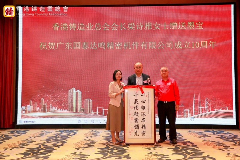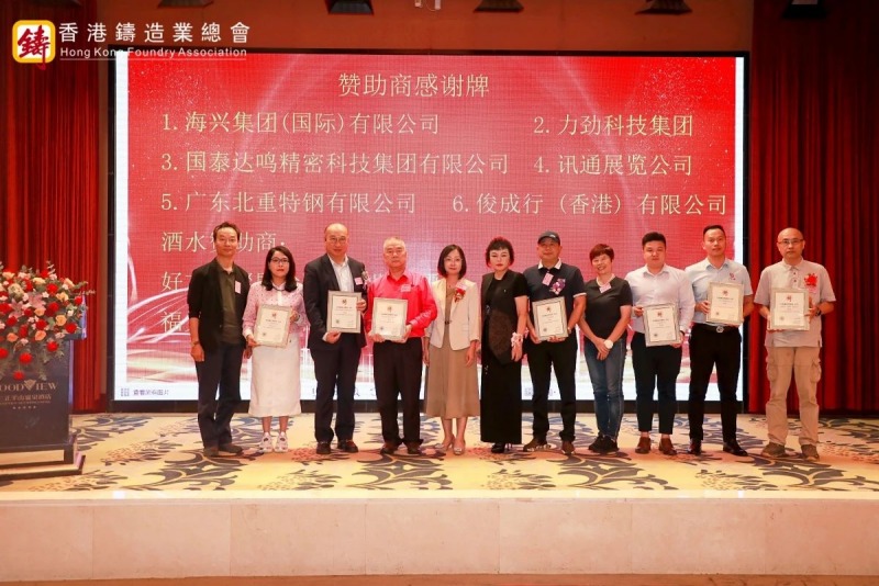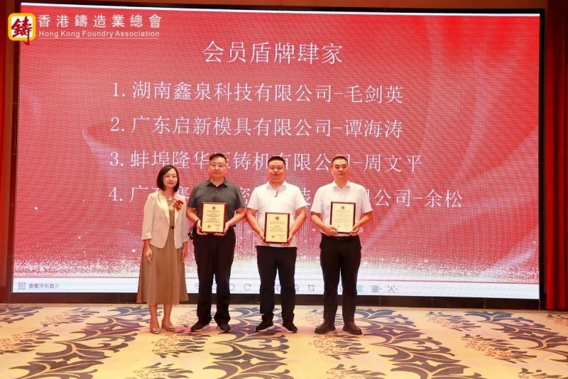 隨后,大會進行了簡約而隆重的頒牌儀式。梁詩雅女士代表總會為四家永久會員企業代表頒發了證書和盾牌,分別為湖南鑫泉科技有限公司、廣東啟新模具有限公司、蚌埠隆華壓鑄機有限公司、廣東賽宏精密清洗裝備有限公司。總會向本次大會大力支持的七家贊助商表達了誠摯的感謝,分別為海興集團(國際)有限公司、力勁科技集團、國泰達鳴精密科技集團有限公司、廣東北重特鋼有限公司、俊成行 (香港) 有限公司、訊通展覽公司、肆拾玖坊頒發感謝狀。