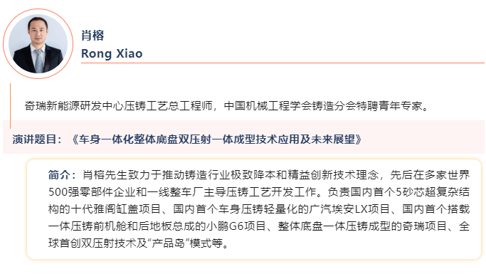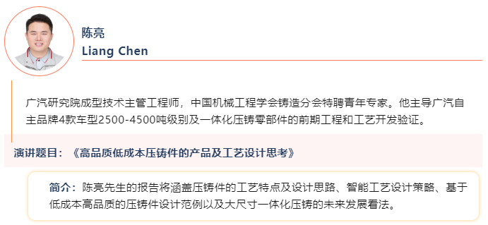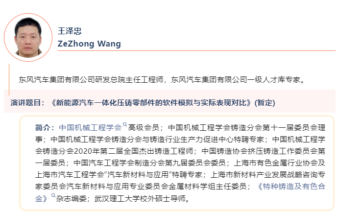 ![]() 2024華南壓鑄產(chǎn)業(yè)會議,將于2024年11月7-8日在深圳維納斯皇家酒店隆重舉行。作為壓鑄行業(yè)知名媒體《壓鑄周刊》傾力打造的線下盛會,大會將匯聚全國優(yōu)質(zhì)的壓鑄資源,構筑華南壓鑄界最專業(yè)的交流平臺。 本次會議面向全國誠邀壓鑄行業(yè)的杰出專家學者,分享高價值的技術報告。截至目前,已有來自奇瑞汽車、上汽通用、廣汽研究院、東風汽車、南昌航空航天大學、嘉瑞集團、宜安科技、中國汽車電子產(chǎn)業(yè)聯(lián)盟(汽車行業(yè)資深專家馬建軍)、尚鎂網(wǎng)(鎂合金資深專家董春明)、海天智勝金屬、伊之密、天津阿瑞斯、FLOW-3D中國等企業(yè)及科研院所的專家學者確認受邀進行演講。 以下為本次會議“新能源汽車及一體化壓鑄”專題的主機廠(東風、奇瑞、廣汽等車廠)專家及演講報告的介紹:
