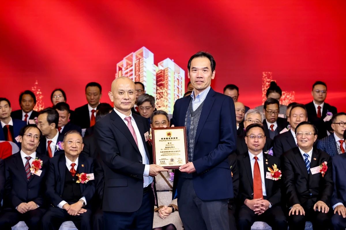 彭凡董事長為香港鑄造業總會名譽顧問張清政博士(右一)頒發委任狀