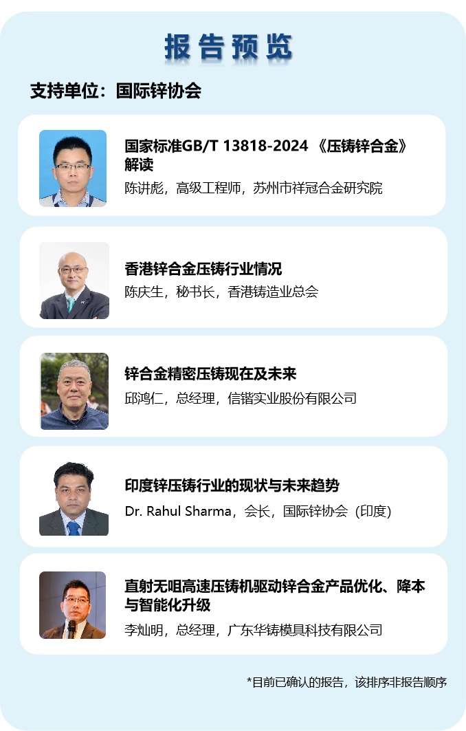 除了邀請來自中國大陸、中國香港、中國臺灣的行業專家作報告外,大會還將著重邀請國際知名專家共同探討全球壓鑄技術、工藝、材料及行業趨勢等話題。其中,美國科羅拉多礦業大學教授Dr. Steve Midson將以《北美壓鑄行業現狀》為題作報告;德國萊茵費爾登有限公司研發主管Dr. Stuart Wiesner將以《新型鋁合金在壓鑄結構件中的可持續發展與應用》為題作報告。 主會場:技術報告