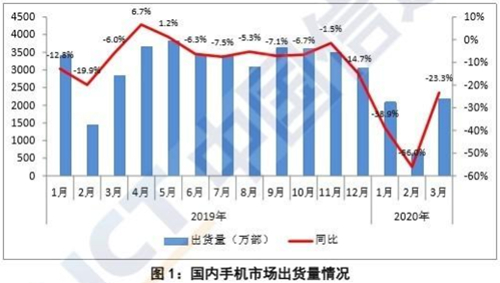 2020年1-3月,國內手機市場總體出貨量4895.3萬部,同比下降36.4%;其中2G手機108.6萬部、4G手機3380.7萬部,5G手機1406.0萬部。