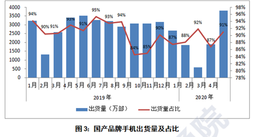 4月,國內(nèi)市場5G手機出貨量1638.2萬部,占同期手機出貨量的39.3%;1-4月,國內(nèi)市場5G手機累計出貨量3044.1萬部,占比為33.6%。
