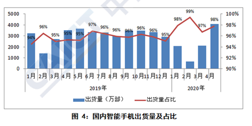 4月,智能手機出貨量4078.2萬部,同比增長17.2%,占同期手機出貨量的97.7%;1-4月,智能手機累計出貨量8851.8萬部,同比下降17.9%,占同期手機出貨量的97.6%。 |