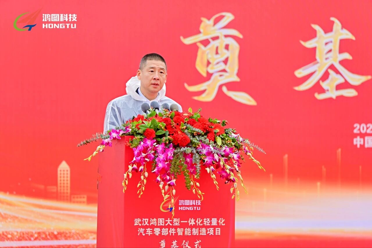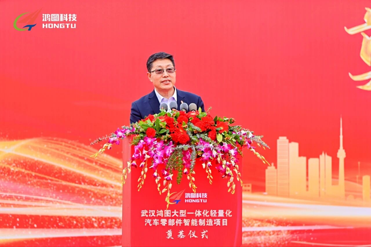 廣東鴻圖黨委書記、董事長劉衛東致辭 廣東鴻圖黨委書記、董事長劉衛東在奠基儀式上,對各級政府及合作伙伴的支持表示感謝。他表示,武漢是汽車工業重要戰略高地,十二年前鴻圖布局武漢已實現深度融合;此次二期項目是響應國家“雙碳”戰略、順應汽車產業發展趨勢的關鍵舉措,將引入超大型一體化壓鑄裝備與核心技術,把武漢基地打造為全國重要增長極,助力武漢“世界車谷”建設。