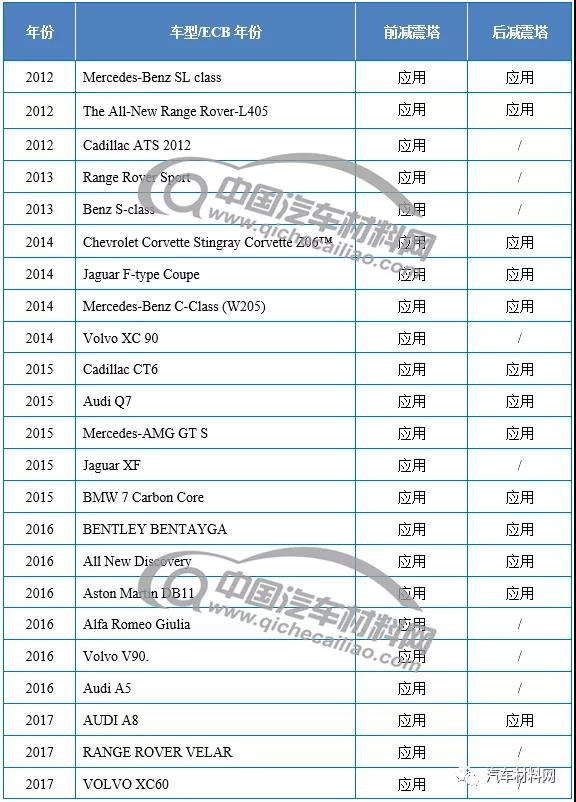 Cadillac CT6車身鑄造鋁合金應用情況 鋁合金減震塔方面,主要采用Al-Si-Mg系和Al-Mg系鋁合金,其中以SF36(AlSi10MnMg)最為成熟。國內江淮已完成高壓鑄造鋁合金減震塔的開發與設計,以及樣件試制;蔚來汽車也已產業化鋁合金減震塔。 近年ECB車型鑄造鋁合金的應用情況