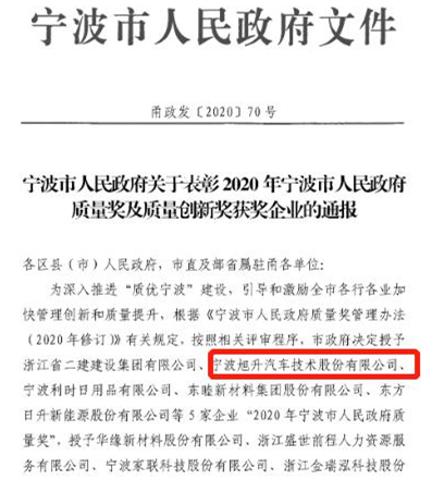 ![]() 日前,寧波市政府辦公廳發(fā)布了《寧波市人民政府關于表彰2020年寧波市人民政府質量獎及質量創(chuàng)新獎獲獎企業(yè)的通報》,決定授予寧波旭升汽車技術股份有限公司等5家企業(yè)“2020年寧波市人民政府質量獎”。 這項榮譽的取得,不僅是對旭升股份所取得的質量成果的高度認可,也是對所有有著“工匠精神”的旭升人的一種鼓舞,更是對公司今后持續(xù)高質量發(fā)展的無聲鞭策。