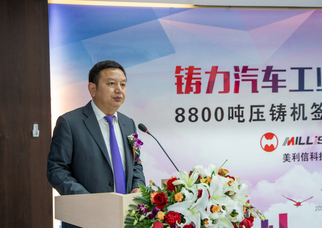 張立波會長發(fā)表致辭 張立波代表中國鑄造協(xié)會對本次活動表示祝賀,對兩家企業(yè)在各自領(lǐng)域取得的優(yōu)異成績表示贊賞。張立波指出,8800噸壓鑄機創(chuàng)造了世界之最,希望兩家企業(yè)以本次合作為新起點,繼續(xù)開發(fā)和應(yīng)用具有自主知識產(chǎn)權(quán)的優(yōu)秀智能裝備,建設(shè)具有國際領(lǐng)先水平的智能標桿工廠,切實擔當起推動我國壓鑄“創(chuàng)新、綠色、智能發(fā)展”的行業(yè)責任!