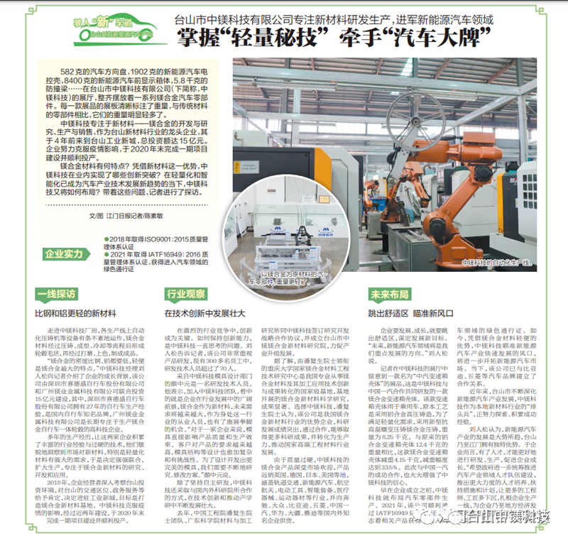 原標題:掌握“輕量秘技”,臺山中鎂科技牽手“大牌”進軍新能源汽車領(lǐng)域 在臺山市中鎂科技有限公司(下簡稱,中鎂科技)的展廳,整齊擺放著一系列鎂合金汽車零部件。每一款展品的展板清晰標注了重量,與傳統(tǒng)材料的零部件相比,它們的重量明顯輕多了。 中鎂科技專注于新材料——鎂合金的開發(fā)與研究、生產(chǎn)與銷售,作為臺山新材料行業(yè)的龍頭企業(yè),其于4年前來到臺山工業(yè)新城,總投資額達15億元。企業(yè)努力克服疫情影響,于2020年末完成一期項目建設(shè)并順利投產(chǎn)。