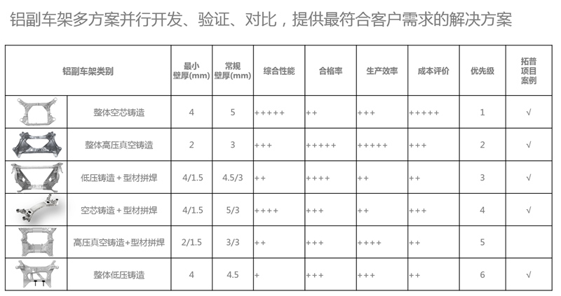 與此同時,由于鋁合金副車架的設計要求高,量產難度大,鋁副車架的鑄造加工合格率一直是業內難題,需要設計、工藝、設備、自動化相互協作,才能達到常規的合格率水平。 基于底盤領域和鋁合金材料領域積累了大量開發經驗,拓普獨立設計并成功量產了多款新能源車鋁副車架。迄今為止,拓普已具備行業唯一的集設計、分析、工藝、試驗、制造于一體的全工藝鋁副車架配套能力,構建了中國乃至全世界最完整的輕量化工藝布局,再結合成熟的底盤襯套、NVH和整車調校能力,已形成了世界領先的輕量化一站式解決方案。可以同步進行多工藝方案的產品設計,再結合減重、性能、成本等各方面因素,為客戶優化設計出最佳解決方案。
