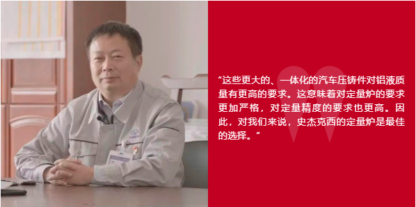 調整生產以滿足新能源汽車市場的需求,并符合 IIoT 的目標,一直是該公司的主要重點。大連亞明是中國工信部選出的“5G+工業互聯網”第一批典型解決方案供應商之一。 定量精度和服務支持 - 未來計劃的基礎 Westomat 定量爐——確切地來說是 45 臺定量爐,包括 1200kg、1700kg 和 2300kg 各種型號——在幫助大連亞明實現其生產目標方面已經發揮并將繼續發揮重要作用。 “史杰克西是世界上最好的定量爐供應商之一,我們通過使用Westomat定量爐無疑也發現了這一點。”大連亞明總經理方建儒先生說道, “十多年過去了,它們的定量精度及質量仍和剛出廠時一樣。而且也易于維護。只要我們需要服務或技術支持,史杰克西就在我們的身邊。” “這對于像我們這樣有雄心壯志的公司來說是非常重要的,這也是我們選擇史杰克西作為戰略合作伙伴的一個重要原因。史杰克西的 Westomat 定量爐非常適合自動化、高質量的生產。”--方建儒,大連亞明總經理 更大的鑄件依賴于更好的定量 大連亞明的另一個重點是尋找滿足日益增長的超大型壓鑄件市場需求的方法。 “史杰克西在新技術的研發總是走在世界前列,我相信他們將繼續應用先進的技術來幫助我們實現高精度、高效率的生產——尤其是在新能源汽車市場方面。”方總經理補充道。