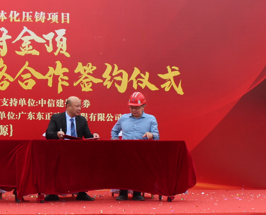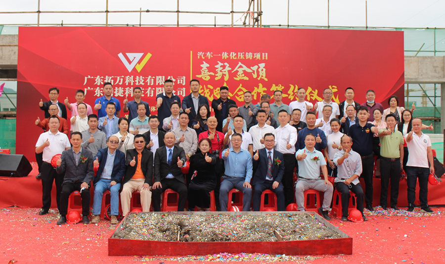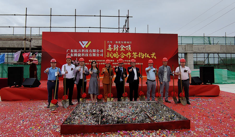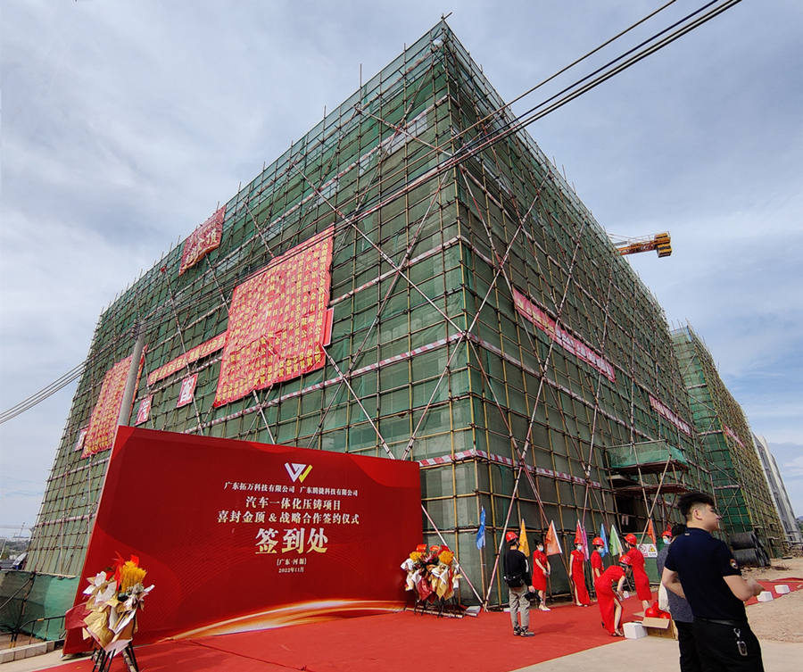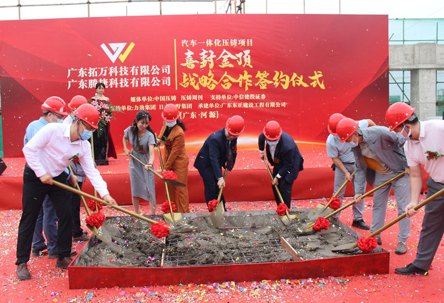 2022年11月1日上午,“廣東拓萬(wàn)科技有限公司(一體化壓鑄)汽配項(xiàng)目封頂儀式暨廣東拓萬(wàn)與力勁集團(tuán)、廣東騰捷與日本牧野機(jī)床戰(zhàn)略合作簽約儀式”,在項(xiàng)目所在地廣東河源市東源縣仙塘鎮(zhèn)鹽東物流園舉行。據(jù)悉,經(jīng)過(guò)一年多建設(shè)的拓萬(wàn)(河源)汽配項(xiàng)目主體建筑正式封頂,一期項(xiàng)目將向力勁集團(tuán)采購(gòu)11臺(tái)大型冷室壓鑄機(jī)。