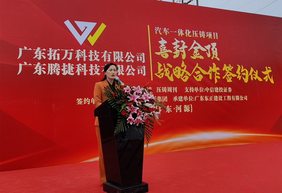廣東拓萬(wàn)董事長(zhǎng)鄒春霞女士 致辭 廣東拓萬(wàn)董事長(zhǎng)鄒春霞女士在致辭中對(duì)東源縣委縣政府、項(xiàng)目施工方、客戶(hù)及供應(yīng)商為項(xiàng)目順利推進(jìn)給予的支持和幫助表示衷心感謝。她表示,拓萬(wàn)汽配項(xiàng)目自2020年簽約落戶(hù),2021年6月開(kāi)始施工,在短短一年多時(shí)間里就完成五棟廠房主體建設(shè),這是拓萬(wàn)公司發(fā)展史上的一個(gè)新的里程碑。按計(jì)劃項(xiàng)目將于明年初正式投產(chǎn)。在此基礎(chǔ)上,拓萬(wàn)公司也將于2023年進(jìn)行股改,2026年申請(qǐng)?jiān)贏股上市。 鄒春霞女士介紹,廣東拓萬(wàn)汽配項(xiàng)目由東莞市拓萬(wàn)實(shí)業(yè)有限公司全資控股,位于廣東省河源市東源縣鹽東物流園,占地面積為40畝,新建廠房等建筑合計(jì)建筑面積5萬(wàn)平米。項(xiàng)目共投資3億,其中廠房建設(shè)1億、設(shè)備投資2億。項(xiàng)目建成后,公司將加大在新能源領(lǐng)域的投入,提高新能源汽車(chē)結(jié)構(gòu)件的產(chǎn)能,助力公司在新能源領(lǐng)域中取得領(lǐng)先地位,進(jìn)而提升公司的市場(chǎng)競(jìng)爭(zhēng)力。 據(jù)介紹,拓萬(wàn)公司在大型(一體化)壓鑄設(shè)備的選擇上,將綜合考慮壓鑄件產(chǎn)品的工藝需求和不同品牌設(shè)備的性能優(yōu)勢(shì),河源汽配項(xiàng)目一期規(guī)劃11臺(tái)壓鑄機(jī),噸位型號(hào)為800T-2500T,200臺(tái)CNC加工設(shè)備;二期規(guī)劃5臺(tái)2500-4500T壓鑄機(jī),200臺(tái)CNC加工設(shè)備。
