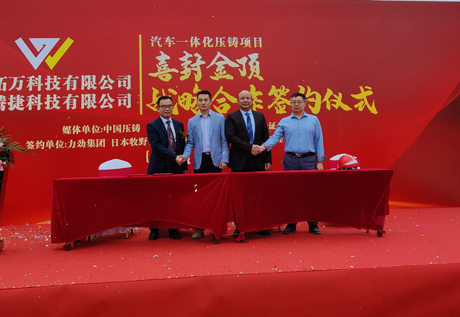緊接著,主辦方舉行了廣東拓萬(wàn)科技有限公司與力勁集團(tuán),廣東騰捷科技有限公司與日本牧野機(jī)床戰(zhàn)略合作簽約儀式,簽約方代表分別在采購(gòu)協(xié)議上簽字。其中,在廣東拓萬(wàn)與力勁集團(tuán)戰(zhàn)略合作協(xié)議部分,廣東拓萬(wàn)將引進(jìn)首批11臺(tái)大型冷室壓鑄機(jī),投放于拓萬(wàn)(河源)汽配項(xiàng)目。