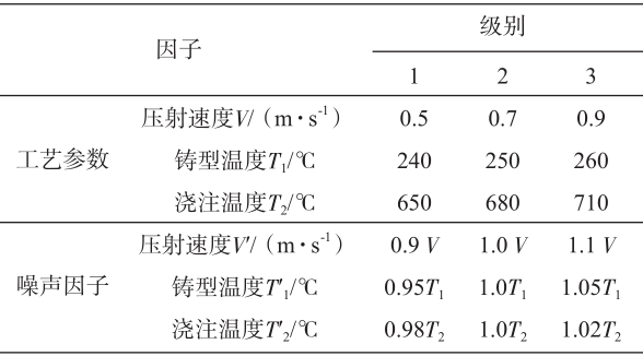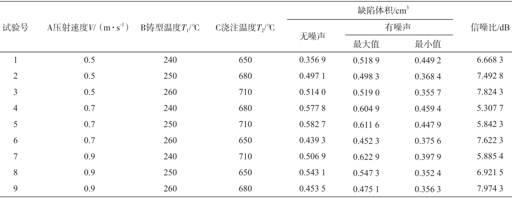 影響壓鑄件品質的因素很多,本論文從影響缺陷體積大小的主要工藝參數角度,確定了正交試驗因素為壓射為0.396 9 cm 3 。也就是說,當消除了所有外部條件的干擾時,第1組工藝參數的組合非常適合工業生產。然而,在實際生產過程中,不可避免地存在一些不可控因素,使得實際壓鑄工藝參數總是圍繞理論值波動。在干擾因素的影響下,信噪比能較好地反映壓鑄件的質量穩定性。可以保證的缺陷體積不一定是最小的,但其波動幅度應是最小的。虛擬正交試驗結果表明,第9組壓鑄工藝參數的信噪比最高,為7.974 3 dB。在第9組試驗中,壓鑄件的質量穩定性最好。在干擾因素的影響下,第9組工藝參數生產的壓鑄件與第1組工藝參數速度V、鑄型溫度T 1 和澆注溫度T 2 。查閱了壓鑄工藝參數的選擇范圍,得到鎂合金冷室壓鑄的壓射速度范圍為0.5~1 m/s,鑄型溫度范圍為240~260 ℃,澆注溫度范圍為650~710 ℃。考慮到在實際生產中,壓力波動和溫