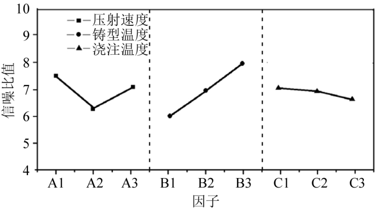 表3 虛擬工藝參數正交試驗結果 從表3可以看出,在上述9組試驗中,在沒有干擾因素的影響下,第1組壓鑄工藝參數的缺陷體積最小,相比質量更穩定。 信噪比的值對應于各因素的水平。通過計算各級各因子的信噪比均值,進一步獲得了信噪比因子水平的極差值。可以預測出針對試驗目標響應的測試因子的最佳組合,即一套保證了產品質量的最穩定壓鑄工藝參數。同時,極差值的大小表示了相應因素的影響大小,極差值較大,表明該因素較活躍,其變化對結果影響也很大;極差值較小,其變化對結果影響也很小。該算法簡單、直觀,易于使用。在表4列出了信噪比均值和不同級別因素的極值的對比結果。 從表4可以看出,極差值最大對應的是鑄型溫度,最小對應的是澆注溫度,因此,試驗因素的順序是鑄型溫度、壓射速度和澆注溫度。表4中各因素的平均信噪比用圖3表示,可以更直觀地解釋工藝參數對缺陷的影響。從圖3可以看出,當壓鑄工藝參數的組合為A1B3C1時,信噪比最大,即壓鑄件的質量穩健性最好。此時,壓射速度為0.9 m/s,鑄型溫度為260 ℃,澆注溫度為680 ℃,與上述9組試驗中第9組工藝參數正好吻合。若上述9組試驗中沒有優化得到的工藝參數組合,需要重新模擬和驗證。