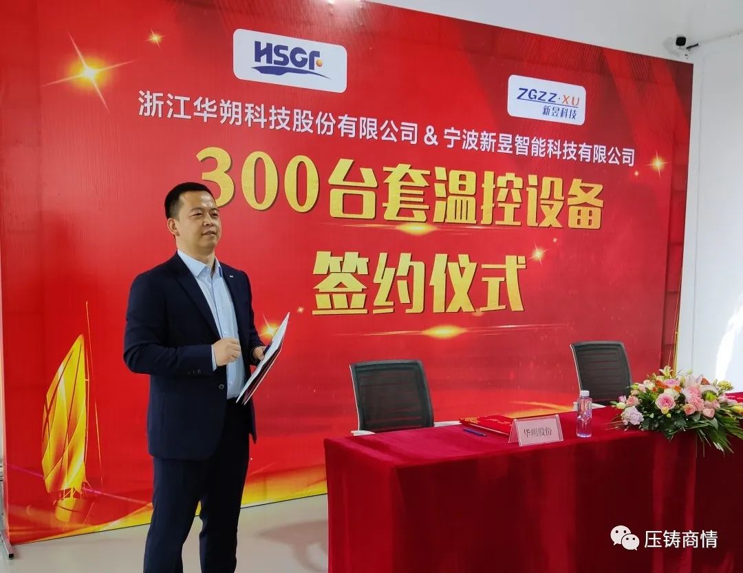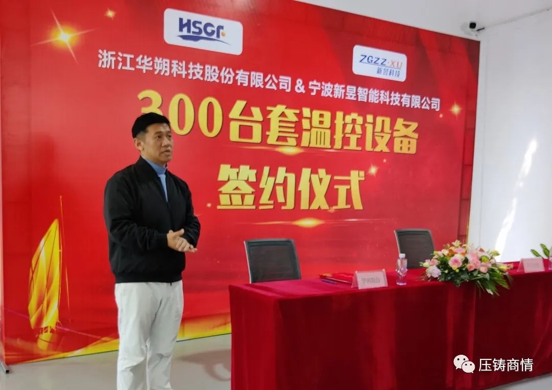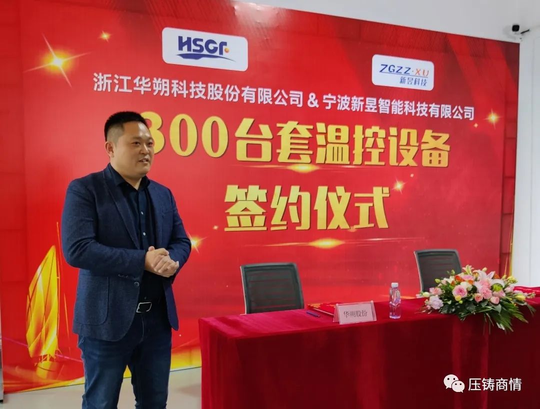 華朔股份CEO沈善忠先生、新昱科技總經理王蘇華先生分別在簽約本上簽字 在活動現場,浙江華朔科技股份有限公司CEO沈善忠先生、寧波新昱智能科技有限公司總經理王蘇華先生分別致辭,并在簽約本上簽字。根據協議,華朔股份向新昱科技采購300臺套壓鑄溫控設備,并于未來三年每年采購數百臺溫控設備,用于新上壓鑄單元及原有壓鑄生產線的設備升級改造。