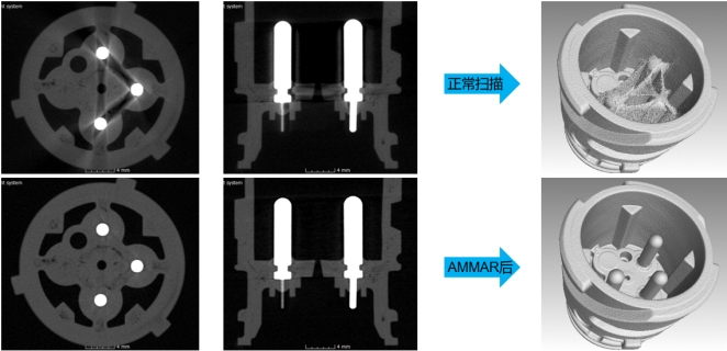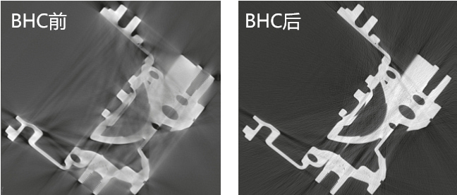 c完善的后處理功能 軟件中可以實(shí)現(xiàn)多種后處理操作,對(duì)掃描結(jié)果進(jìn)行優(yōu)化和改善,幫助我們獲得比較完美的掃描數(shù)據(jù)。比如在下圖中展示的復(fù)合材料偽影抑制效果(左)和射束硬化修正的效果(右)。