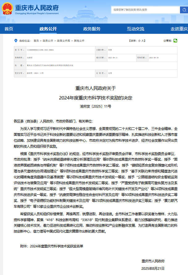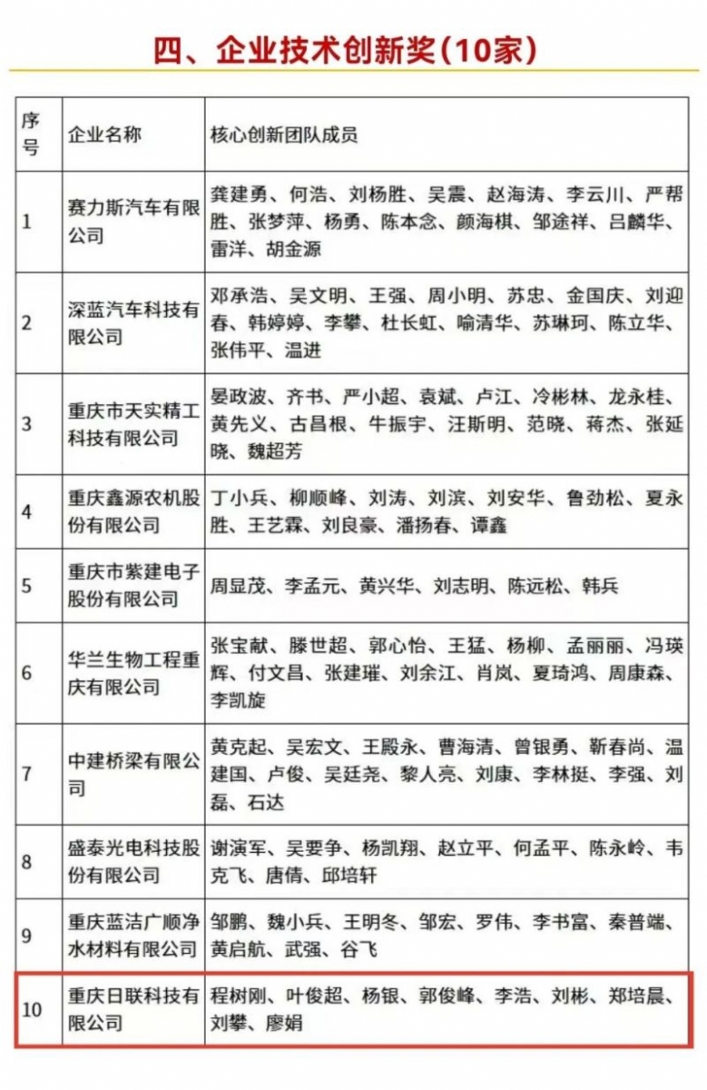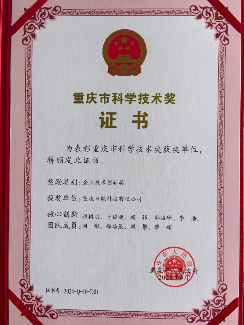 8月28日,重慶市科技創新大會召開,會議宣讀了2024年度重慶市科學技術獎勵的決定。重慶日聯科技有限公司獲評“企業技術創新獎”。 2024年重慶市科學技術獎獲獎名單(同等級獎項排名不分先后)