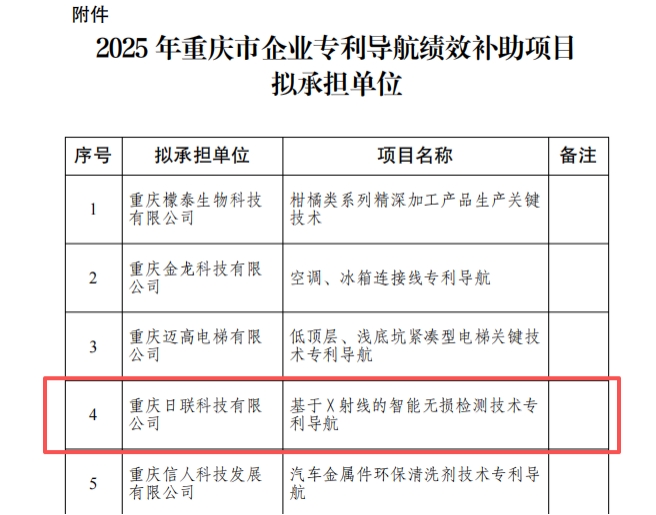 ![]() 近日,重慶市知識(shí)產(chǎn)權(quán)局公示2025年度企業(yè)專利導(dǎo)航績(jī)效補(bǔ)助項(xiàng)目擬承擔(dān)單位,重慶日聯(lián)科技有限公司憑借在工業(yè)X射線智能檢測(cè)領(lǐng)域的突出成果成功入選。作為國內(nèi)X射線檢測(cè)裝備領(lǐng)軍企業(yè),日聯(lián)科技以專利導(dǎo)航為核心戰(zhàn)略工具,在技術(shù)突破、產(chǎn)品升級(jí)、專利布局與產(chǎn)業(yè)賦能等方面實(shí)現(xiàn)系統(tǒng)性創(chuàng)新,為重慶智能制造高質(zhì)量發(fā)展樹立標(biāo)桿。
