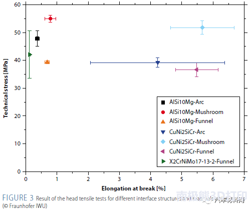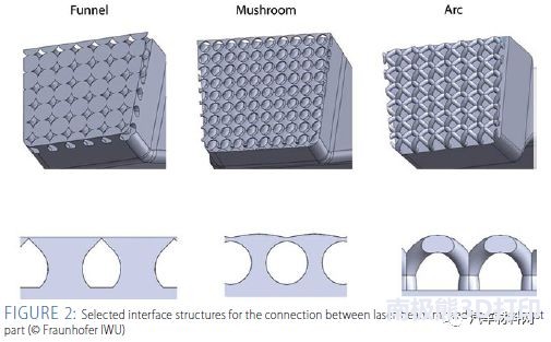 ![]() 圖1 激光熔化(Laser Beam Melting-LBM)和激光金屬粉末沉積技術(Laser Metal Deposition-LMD)具有可生產復雜形狀部件的優勢,特別適用于復雜零部件的小批量生產。近年來,其在航空航天、醫療、汽車等領域有了越來越多的應用。盡管如此,增材制造由于生產時間相對較長,生產成本較高,仍然很難實現工業生產。 與增材制造相比,壓鑄工藝可在短時間內生產出大批量的產品。得益于高達12米/秒的填充速度,壓鑄部件的生產周期每個組件僅需幾分鐘就可完成。然而,擁有高生產效率的同時也有一些缺點:如,高復雜程度的部件不能成型較難,且往往需要更為精細的模具。生產過程高機械強度、熔體的沖擊磨損以及較大的溫度波動都導致壓鑄模具較為昂貴。此外,一個模具一般只能生產一種形狀的零件。 作為Agent-3D聯合項目的一部分,由德國聯邦教育和研究部資助的CastAutoGen項目致力于將增材制造與壓鑄工藝相結合,形成混合工藝鏈,更好的發揮這兩種工藝的優勢。工藝路線的設計充分考慮生產周期和成本因素,將簡單的大體積結構區域采用壓鑄工藝制造,高功能化和復雜程度較高的部件區域采用二者相結合的工藝?;诖嗽O計了兩套工藝方案:方案1研究了將附加插入和裝配到單一模具中;方案2研究了如何通過LMD在單一壓鑄構件上創建附加結構。 1模具中附加零件的制造 方案1研究了利用激光束熔化技術實現復雜結構壓鑄成形工藝。該方案中,加強筋、熱交換器、支架等結構通過激光束熔化制造,然后插入模具,再這些部件周圍開始鑄造。具體如圖1。該方案還研究了不同幾何形狀的界面改性技術,以達到更好的結合性。 研究者針對汽車輔助單元支架的壓鑄模具進行改進,使得插件能模塊化的容納在模具中。在激光熔融工藝的設計和開發中,需特別注意連接區域結合界面的幾何形狀和表面修飾。因此,研究了如圖2所示的三種界面結構的連接機械性能,拉伸試驗結果如圖3所示。