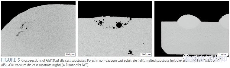 從圖5(左)中可以看出,常規生產的鋁壓鑄部件會有一些不規則分布的孔。當激光熔化孔周圍的材料時,將造成孔的膨脹,導致起泡,如圖5(中)。而真空鑄造工藝可有效改善孔隙問題,防止起泡,如圖5(右)。