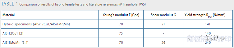 下表1展示了混合部件和單一材料的機械性能對比,雖然性能略低于單一材料的文獻參考值,但均符合汽車工業的要求。且在測試中,相關的連接區域沒有發生失效。