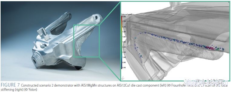 基于該工藝,研究人員制造了一個發動機支撐結構,如圖7(左)。由于奧迪這款產品已停產,所以未能進行真空鑄造。從圖7右側的CT掃描中可以看出,通過LPD生產的加強肋幾乎沒有孔隙。其僅在壓鑄和附加結構之間的過渡區域中出現部分孔隙。目前該團隊正在研究制造用于動態/靜態力學性能以及耐腐蝕性測試的部件。