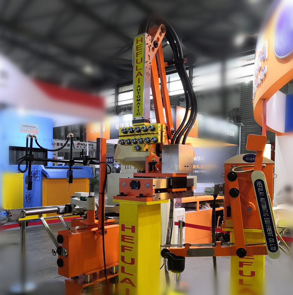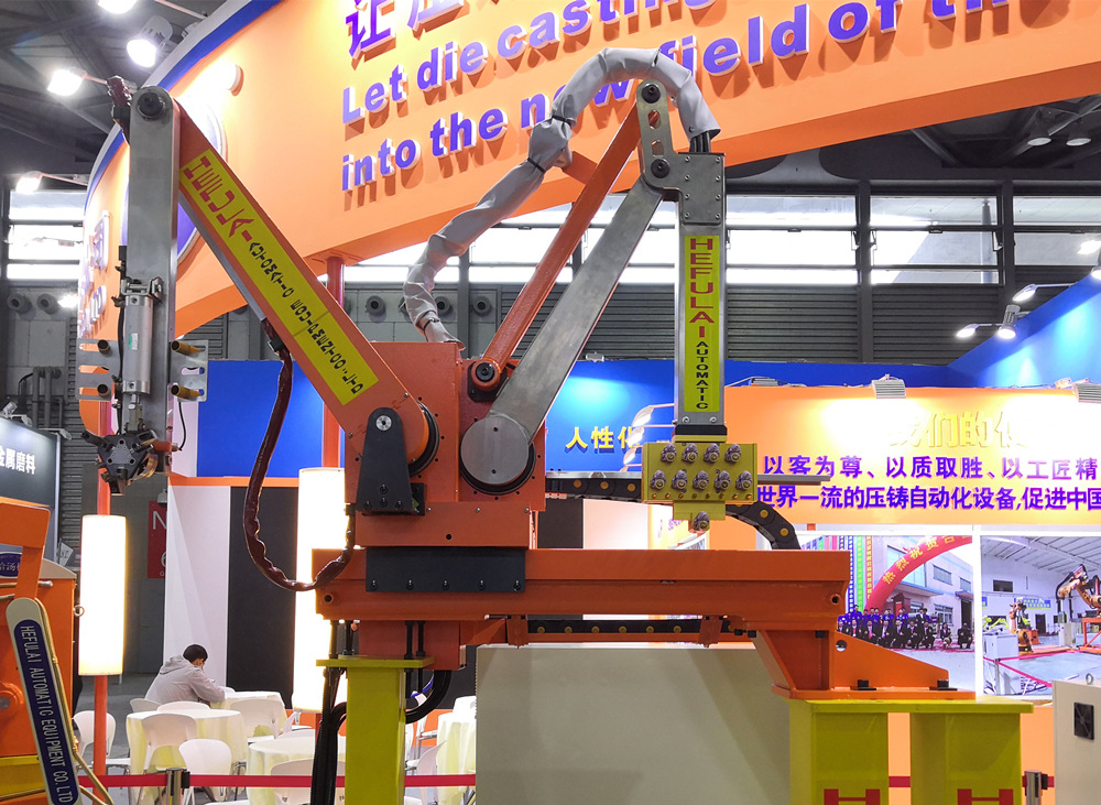 東莞合富萊機器人集成壓鑄島 據介紹,在機器人集成壓鑄島方面,東莞合富萊已完成從自主知識產權的控制系統,到硬件部分,除機器人本體以外的中央控制柜、夾爪、制品檢出、底座、H320沃鈴模組、閥體控制箱、架臺等的開發和制造。同時,聯合用戶的應用場景,開發了許多訂制化的壓鑄島解決方案,掌握了成熟的技術、工藝及應用經驗。公司已為汽車零部件、5G基站配件等壓鑄件生廠商,提供數量眾多的機器人集成壓鑄島生產線。 新型連桿噴取機器人首次亮相華東展會 值得一提的是,東莞合富萊此次展示的HFLREB系列連桿噴取機器人,為首次在國際壓鑄展上展示的產品。這款新產品是在噴取一體線性機器人基礎上進行全面改進的新機型,由于線性機器人導軌長期高溫、腐蝕氣體影響,導致導軌使用壽命短;同時安裝于頭板正上方,取出壓鑄件時,容易受脫模劑霧氣污染,為此該新機型引入傳統壓鑄“三手”的連桿結構的優勢,結合用戶實際生產的實踐并不斷改進優化,既保留了原噴取一體線性機器人的優點,又成功解決了這一缺陷問題。