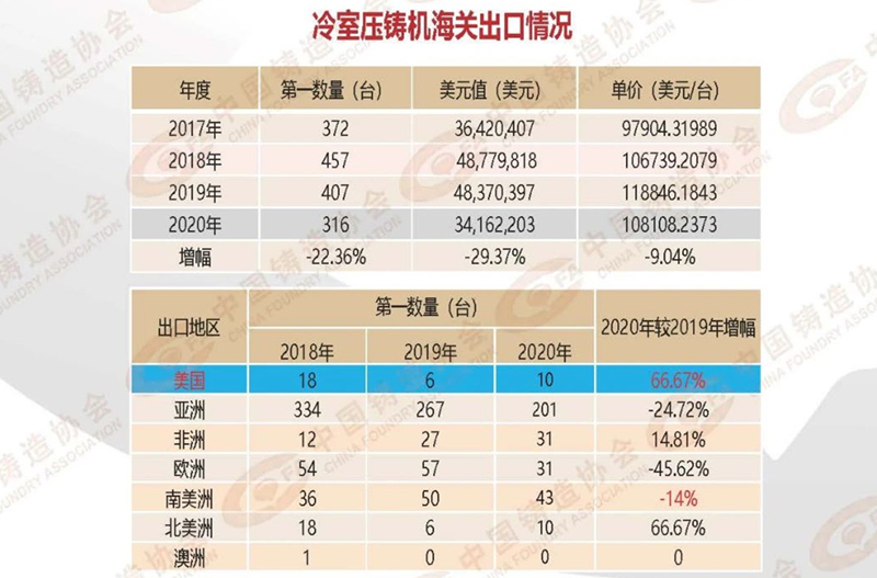 冷室壓鑄機出口數據統計,2020年出口316臺,減少22.36%。其中出口北美洲較2019年增長66.67%;出口非洲較2019年增長14.81%。 |