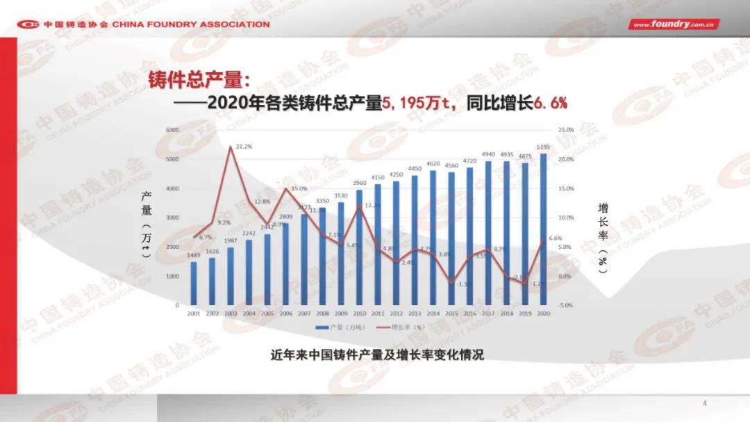 ![]() 來自中國鑄造協會消息,2020年年底,我國部分經濟指標已經恢復到疫情前的水平,機械工業也得到快速恢復。受下游主機行業的帶動,2020年我國鑄件總產量達到5195萬噸,同比增長6.6%。