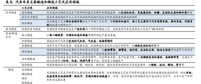 從白車身部位來看,防撞梁、發罩鋁合金的鋁合金應用門檻最低,其次是行李箱蓋、 翼子板及其它覆蓋件。包括 B 柱、縱梁、門檻、頂蓋縱梁等關鍵傳力結構件在內 的白車身本體對設備成本、節拍、連接工藝質量控制都有較高要求,應用鋁合金相 對較難。目前已知已經在開發或已經在應用鋁合金材料的有:電池托架、減震塔、 后 A 柱、D 柱、門框、座椅、后橋、后縱梁等。 車身用鋁行業增長空間巨大。根據國際鋁業協會的計算,純電動車用鋁最高可達 361.3kg,占整備質量的 33.1%。2018 年單車用鋁為 128.4kg,滲透率(實際用鋁 /理論用鋁最大值)為 31%,預計 2025 年單車用鋁達到 226.8kg,滲透率為 50%; 2030 年單車用鋁達到 283.6kg,滲透率為 56%。 汽車鋁壓鑄件向大型化、一體化發展 汽車壓鑄工藝主要分為鑄造、鍛造、沖壓三大類。 1)鑄造是將液體金屬澆鑄到與零件形狀相適應的鑄造空腔中,待其冷卻凝固后, 以獲得零件或毛坯的方法。分為壓力鑄造、擠壓鑄造等。采用鑄造工藝生產的 零件主要為殼體類和支撐類, 2)鍛造是一種利用鍛壓機械對金屬坯料施加壓力,使其產生塑性變形以獲得具 有一定機械性能、一定形狀和尺寸鍛件的加工方法。采用鍛造工藝生產的零件 主要為力學性能要求較高的零件,例如車輪、底盤懸架系統控制臂、轉向節、 空調壓縮機渦旋盤等。 3)沖壓是將原材料用合適的沖壓模具沖壓成型。是在常溫下用沖床等機器將半 成品做成成品的過程。汽車制造中 60%-70%的金屬零部件需要經過塑性加工, 沖壓是重要的手段,如各種覆蓋件、車內支撐件、架構加強件,以及發動機排 氣管及消聲器、空心凸輪軸、油底殼、發動機支架、框架結構件、橫縱梁等。 4)在汽車鋁合金壓鑄工藝中,壓力鑄造占比 80%左右,鋁合金擠壓件和鋁合 金沖壓件各占 10%左右。