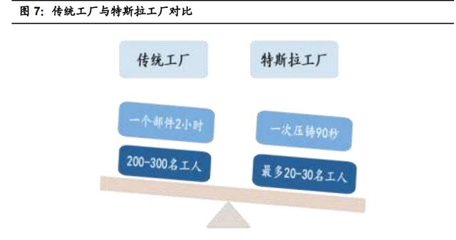 一體壓鑄技術大量節省了生產線成本和基礎設施成本。Model 3 后底板有 70 多 個零部件,利用一體壓鑄技術,特斯拉將其整合為 Model Y 上的 2 個大件,焊點由大約 700-800 個減少到 50 個。由于生產零部件需要各種模具、機器臂、 夾具,組裝零部件則需要不同的生產線,因此零部件的大量減少必然能顯著降低模具成本和組裝成本。同時,一臺壓鑄機占地僅 100 平方米,根據埃隆-馬斯 克所述,采用大型壓鑄機后,特斯拉工廠的占地面積減少了 30%,基礎設施成本大幅降低。根據特斯拉官方的數據,一體壓鑄技術預計將給 Model Y 節省約 20%的制造成本。 一體壓鑄技術顯著降低生產的時間成本和人力成本。一體壓鑄機一次壓鑄加工 的時間僅為 80-90 秒,每小時能完成 40-45 個鑄件,一天能生產 1000 個鑄件; 而傳統工藝沖壓焊接成一個部件至少需要兩個小時,一體壓鑄的生產效率明顯 更高。同時,由于應用了新的合金材料,壓鑄件的表面粗糙度可達 Ra0.8-3.2μm, 足夠光滑,基本不用再進行機加工。一體壓鑄顯著減少了生產的時間成本。國內平均每個焊裝車間配備 200-300名生產線工人,采用一體壓鑄技術后,基于 生產流程的簡化,所需的技術工人至少能縮減到原來的十分之一。生產的人力成本被大大降低。