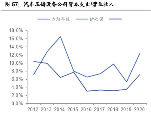 資本支出方面,南山鋁業資本支出行業領先,2020 年研發支出 28.5 億元,占 收入比重為 12.8%。其次為立中集團(4.8 億元,占比為 3.6%)、明泰鋁業(3.6 億元,占比為 2.2%)、亞太科技(1.6 億元,占比為 3.9%)、永茂泰(1.6 億元, 占比為 3.9%)。 中游設備 營收以及凈利潤規模方面,力勁科技收入水平較高,伊之密收入增長較快,2020 年收入規模接近,力勁科技 2020 年營收 33 億元,伊之密收入為 27 億元。凈 利潤方面,2020 年伊之密與力勁科技凈利潤均為 3 億元左右。 毛利率方面,伊之密毛利率保持在 35%左右,力勁科技為 26%左右。凈利率方 面,伊之密凈利率較為穩定,2020年伊之密凈利率為11.8%,力勁科技為8.5%。 ROE 方面,伊之密 ROE 為 20%左右,力勁科技為 6%左右。ROA 方面,伊之 密為 10%左右,力勁科技為 5%左右。 研發方面,2020 年伊之密研發支出為 1.3 億元,占營收比重為 4.7%,伊之密 研發支出為 0.19 億元,占營收比重為 0.5%。 資本支出方面,伊之密與力勁科技水平相當,2020 年伊之密資本支出為 3.4 億 元,占營收比重為 12.4%,力勁科技資本支出為 2.4 億元,占營收比重為 7.2%。