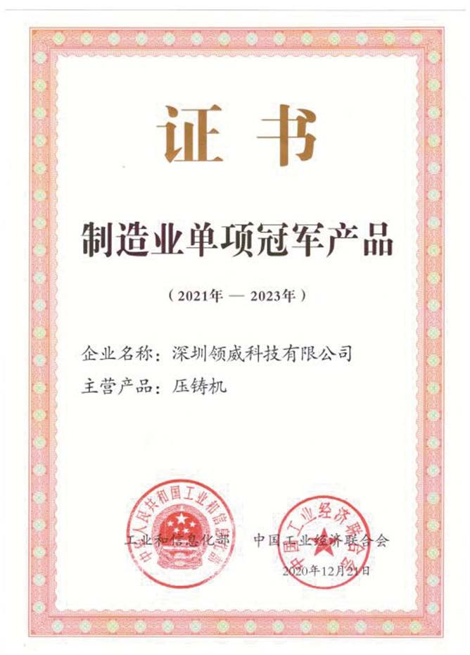 ▲ 圖5 9000T 巨型壓鑄單元 繼6000T壓鑄單元后再一次打破了壓鑄單元鎖模力的記錄,推動整個汽車產業制造模式發生了巨大的變革。力勁DreamPress 9000T 大型壓鑄單元采用一次壓鑄成型工藝,在技術和結構上取得了很大突破。有別于傳統的三板式和兩板式壓鑄單元,在保證安全性、穩定性和耐用性的前提下,通過合理的設計和高新技術材料的應用盡量減輕了壓鑄單元的自重,優化了整體布局,減小了壓鑄單元占地面積,節省了成本,降低了能耗,且性能更卓越,應用范圍更廣,可以充分滿足汽車制造、大型重型壓鑄件及多部件的一體化生產工藝要求,持續引領全球超大型壓鑄裝備制造技術的發展;2022年下半年,力勁集團自主研發的12000噸超大型壓鑄單元即將發布并交付客戶。 力勁集團作為國際標準化組織鑄造機械技術委員會(ISO/TC306)成員以及全國鑄造機械標準化技術委員會金屬熱成型分技術委員會(TC186/SC2)秘書處承擔單位,主導或參與制定國際標準2項,國家標準18項、行業標準18項,為行業的發展貢獻力量,提高了中國壓鑄裝備的國際競爭力和話語權。 力勁LK品牌壓鑄機現已成為享譽海內外的首選品牌,是中國壓鑄機行業唯一被國家質監總局授予“中國名牌”稱號的企業,2021年,力勁壓鑄機入選全國第五批制造業“單項冠軍產品”,見圖6。