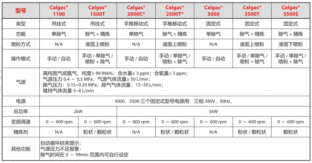 Calgas ® 除氣機有單除氣功能的 1100、2000C、3000 型,除氣精煉結合為一體的1500T、2500T、3500T和3500S型可選,并可針對客戶的需求特別設計。