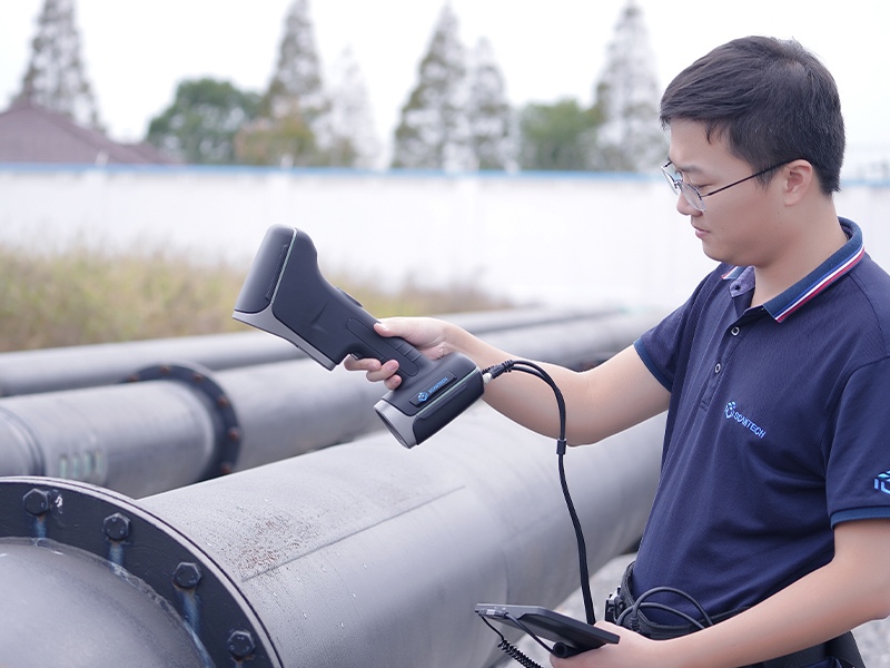 03 三維測(cè)量的挑戰(zhàn) 04 解決方案 為了更為高效精準(zhǔn)地評(píng)價(jià)管道外表面缺陷,客戶最終選擇了思看科技KSCAN系列復(fù)合式3D掃描儀搭配AirGO Power無(wú)線測(cè)量模塊。 KSCAN系列是全球首款紅外+藍(lán)色激光計(jì)量級(jí)復(fù)合式三維激光掃描儀,內(nèi)置全局?jǐn)z影測(cè)量系統(tǒng),輕松應(yīng)對(duì)大尺寸管道的三維數(shù)據(jù)采集,標(biāo)配多種工作模式,適用于各種復(fù)雜缺陷處的精密測(cè)量,極大簡(jiǎn)化了管道三維檢測(cè)全流程。