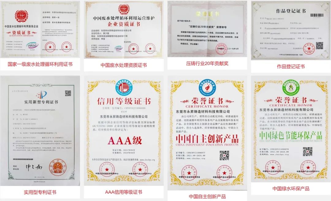 針對脫模劑質量及廢液回收的難點,永昇科技研發出壓鑄專用脫模劑和脫模劑廢液凈化再利用系統。壓鑄專用脫模劑,可有效的減少壓鑄件因高溫產生粘模、起泡、熱裂和燒傷的缺陷,延長模具的使用壽命。 脫模劑廢液凈化再利用系統,采用獨特綠色、純物理方法,無需任何藥劑,徹底解決脫模劑廢液中雜油、臭味、蠟質成分、顆粒難題;凈化完全符合回用要求,不會帶來產品發黑等質量問題,實現廢液零排放;凈化液100%回收再利用,減少脫模劑用量約40%,降低用液成本;在線濃度監測,精準自動配比,保障脫模劑用液濃度;智能控制系統,全自動運行,可實現無人值守,維護量小。