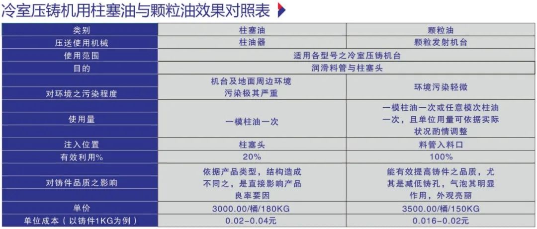 另外其優點還有:清潔又光亮的鑄件,表面完全沒有油痕,不同處一目了然;沒有油渣,澆注口,流道和溢流井的材料可熔再用,無煙且省成本;干凈的地板和天花板,沒有黑煙,用顆粒油整個機臺區域可以保持干凈,免除了因潤滑柱塞油造成環境污染之處理;口型,口腔區可保持干凈,免除了因油性注塞潤滑油所產生之碳積物,減少了停機時間。