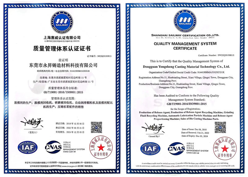 ![]() 東莞市永昇鑄造材料科技有限公司(簡稱“永昇科技”),位于廣東省東莞市清溪鎮廈坭管理區,經過多年的發展,已建成健全的研發團隊、專業的銷售團隊,采取研發生產與營銷分離的經營模式。公司主要從事研發、生產及銷售金屬合金鑄造脫模劑、硅油乳液、長鏈烷基芳基硅油、氧化聚乙烯蠟乳液、顆粒潤滑劑、被覆劑、除渣劑等壓鑄耗材和輔料及離型劑配比機、自動潤滑顆粒機、脫模劑回收系統設備等。 目前,永昇科技已形成自動潤滑顆粒機、壓鑄專用脫模劑、脫模劑廢液凈化再利用系統、離型劑自動稀釋比例機四大主營產品。 自動潤滑顆粒機(環保機型) 自動潤滑顆粒機為永昇科技公司的拳頭產品,融入公司近20年沉淀的技術及經驗,占有很高的市場占有率。該設備可自動分配潤滑顆粒油進入冷室壓鑄機的料管,改善柱塞頭與料管之間潤滑效果,并可增強鑄件的脫模性,避免造成鑄件因柱塞油所形成的氣孔。對環境污染影響極其輕微。 使用顆粒潤滑動頭珠(顆粒油)具有諸多優點:可使鑄件孔隙?。ㄋ追Q鑄孔、砂孔),不會產生氣體,減少了孔隙的問題;增加噴射速度,顆粒油成份中所含的磨擦降低添加劑可增加低速噴射速度10%,高速噴射速度20%可用噴射監察器證實;清潔的極其干凈,沒有廢物,材料于鑄造時完全消耗完,機器后部不會污穢,而且沒有需要處理的廢油;延長注塞頭壽命,比起用純油壽命有20%的改良。比起水性柱塞潤滑劑,管尖壽命可延長十倍。