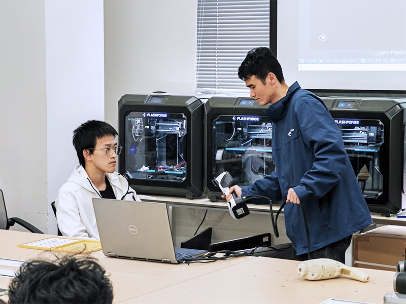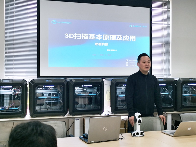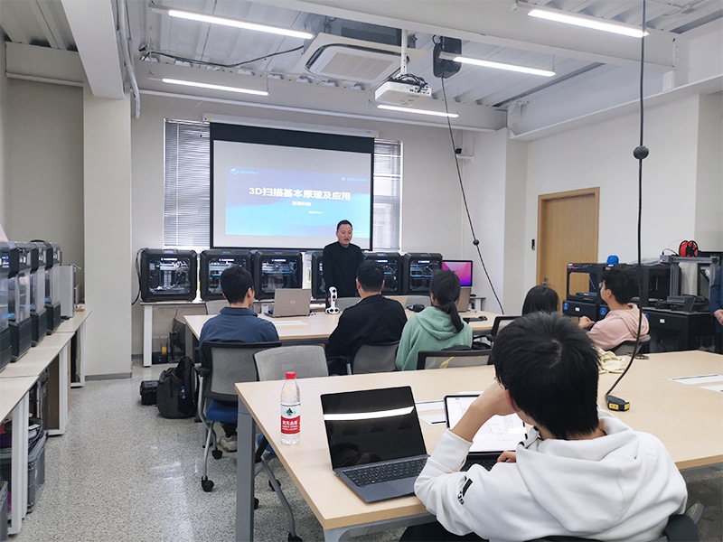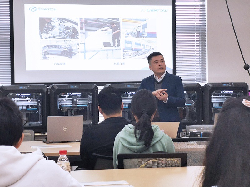 思看科技資深技術(shù)專家、上海交通大學優(yōu)秀校友張喆專題為學生細致地講解了三維掃描基本原理及應用、3D掃描軟件的基本操作、3D掃描產(chǎn)品在各行業(yè)的典型應用案例等,帶領(lǐng)學生們?nèi)嬲J知3D掃描技術(shù)的發(fā)展現(xiàn)狀和未來趨勢。分享結(jié)束后,同學們就各自感興趣的技術(shù)問題和困惑進行了深入的探討。