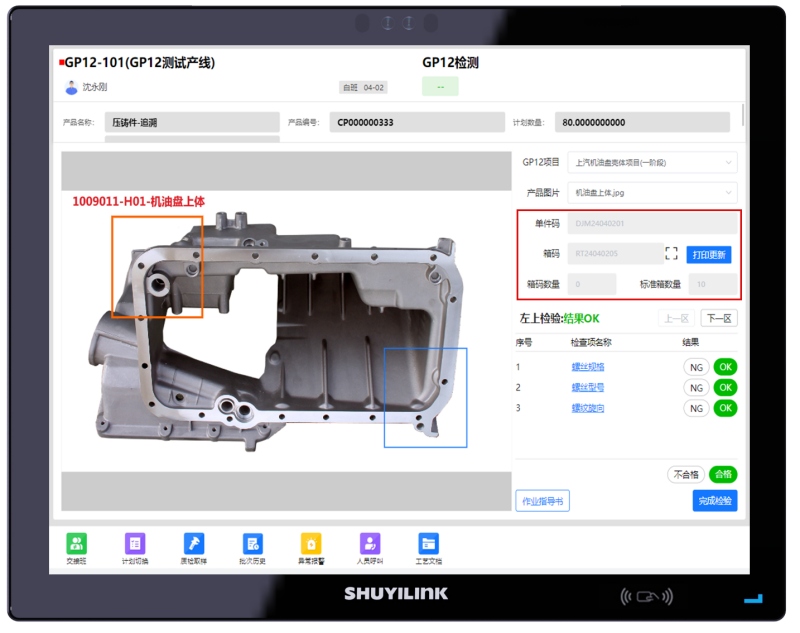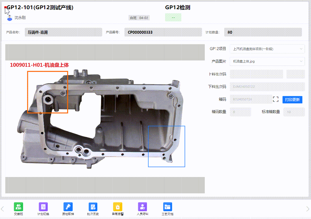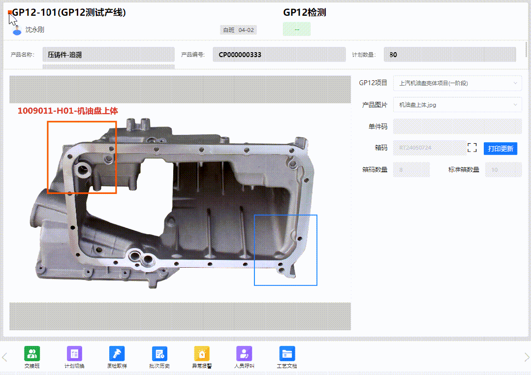 GP12產(chǎn)線終端界面(適用單件產(chǎn)品) 當(dāng)檢測合格數(shù)量達(dá)到產(chǎn)品標(biāo)準(zhǔn)箱數(shù)量時(shí),會自動觸發(fā)箱碼打印,同時(shí)支持二次檢驗(yàn)、不滿箱打印,產(chǎn)品換箱等多種使用場景,基本覆蓋了客戶對GP12系統(tǒng)流程的所有要求。【適用范圍:單件管理的產(chǎn)品】