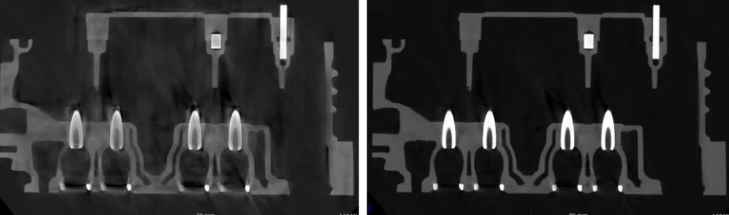 散射偽影影響降低對原始圖像和表面判定帶來的變化有哪些? 01孔隙率分析影響: 對表面判定的真實性,缺陷判斷的準確性,對比度受霧狀偽影影響減少并提高對比度。