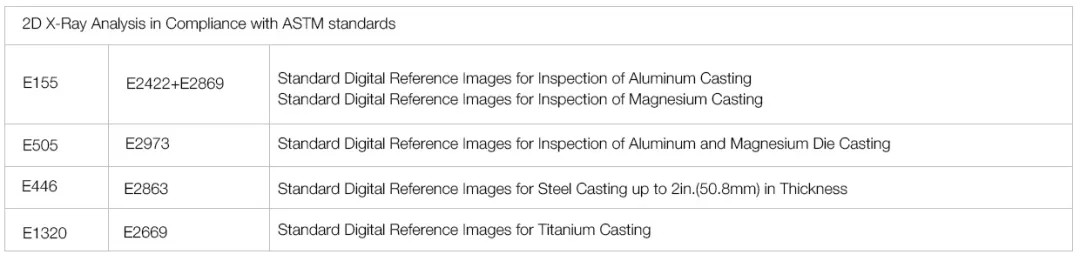 截止今日X-Ray已廣泛的用于鑄件的無損檢測領域,并且根據不同的應用場景及客戶需求演化成了兩派,分別是2D和3D。其中2D檢測由于其成像速度快,能夠做到100%在線全檢,從而得到了各大主機廠及其供應商的廣泛應用,也催生了相應的行業和企業標準。其中最被廣泛接受和使用的為ASTM制定的行業標準和主機廠設立的企業標準。