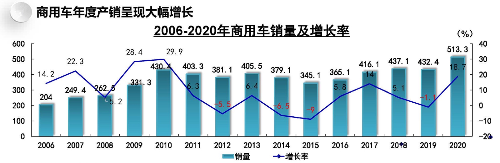 從5月開始,乘用車產銷開始保持增長,其對汽車產銷的增長貢獻度持續擴大,成為主要拉動汽車市場增長的因素。 商用車年度產銷呈現大幅增長 2020年12月,商用車產銷分別完成50.9萬輛和45.6萬輛,同比增長2.3%和2.4%。2020年全年產銷分別完成523.1萬輛和513.3萬輛,首超500萬輛,創歷史新高,商用車產銷同比分別增長20%和18.7%,產量增幅比上年提高18.1個百分點,銷量增速比上年實現了由負轉正。