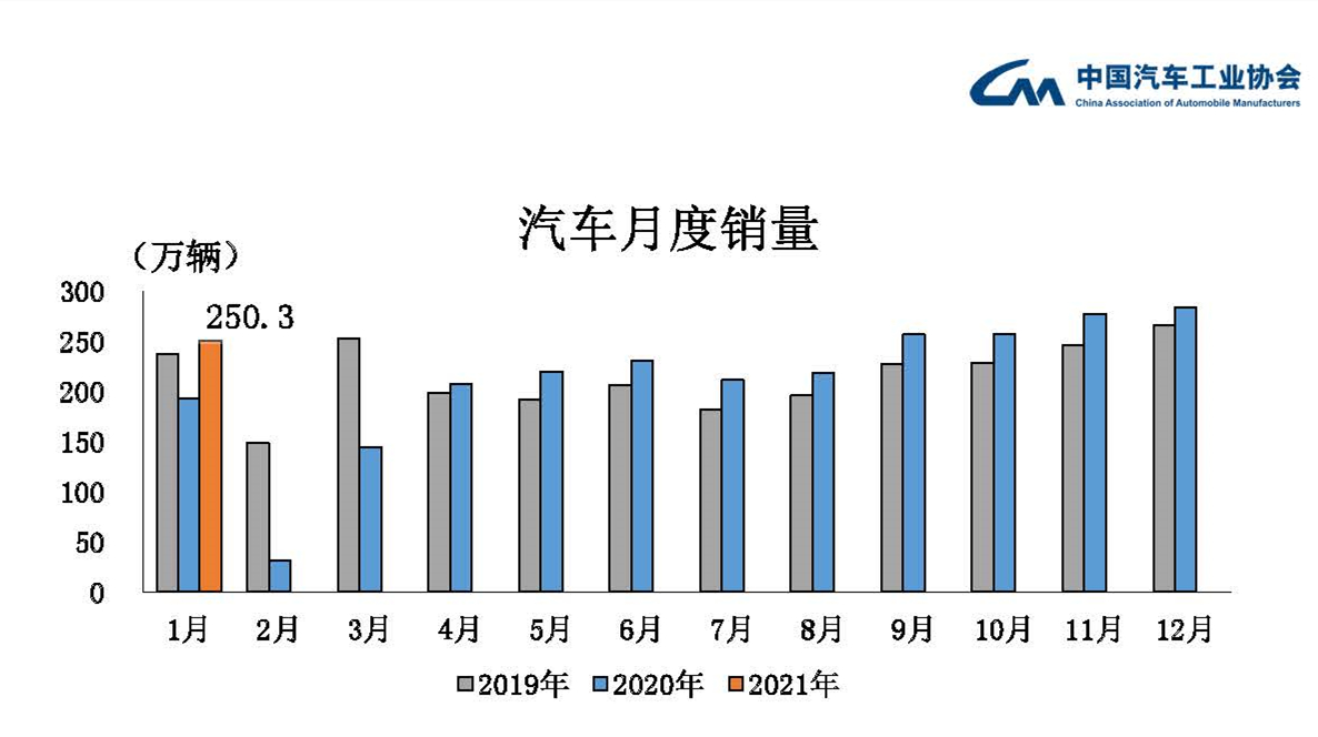 ![]() 壓鑄周刊(2021年3月2日 北京)日前,中國汽車工業協會發布汽車工業經濟運行數據。2021年1月,汽車產業延續了較好的發展態勢,本月汽車產銷同比增幅較大。汽車產銷分別完成238.8萬輛和250.3萬輛,同比分別增長34.6%和29.5%。新能源汽車產銷分別完成19.4萬輛和17.9萬輛,同比分別增長285.8%和238.5%。 從市場情況來看,總體需求保持穩定,去年同期基數較低,本月汽車銷量呈現大幅增長。其中受乘用車及商用車銷量的拉動,月度銷量連續10個月刷新當月歷史記錄。新能源汽車繼續延續2020年下半年的發展態勢,且銷售連續7個月刷新當月歷史記錄。汽車出口也繼續延續復蘇態勢,本月刷新當月出口歷史記錄。 汽車產銷同比大幅增長 1月,汽車產銷分別完成238.8萬輛和250.3萬輛,環比分別下降15.9%和11.6%,同比分別增長34.6%和29.5%。本月產銷同比呈現大幅增長主要是當前市場需求仍在恢復;2020年春節假期在1月,加之去年年初疫情影響,基數較低。