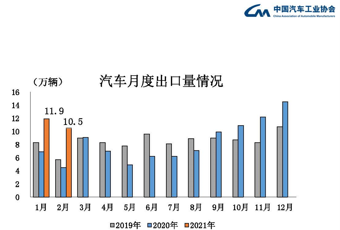 汽車出口繼續刷新當月歷史記錄 2月,汽車企業出口10.5萬輛,環比下降12.5%,同比增長1.3倍。本月出口數據繼續刷新當月歷史記錄。1-2月,汽車企業出口22.4萬輛,同比增長97.8%。