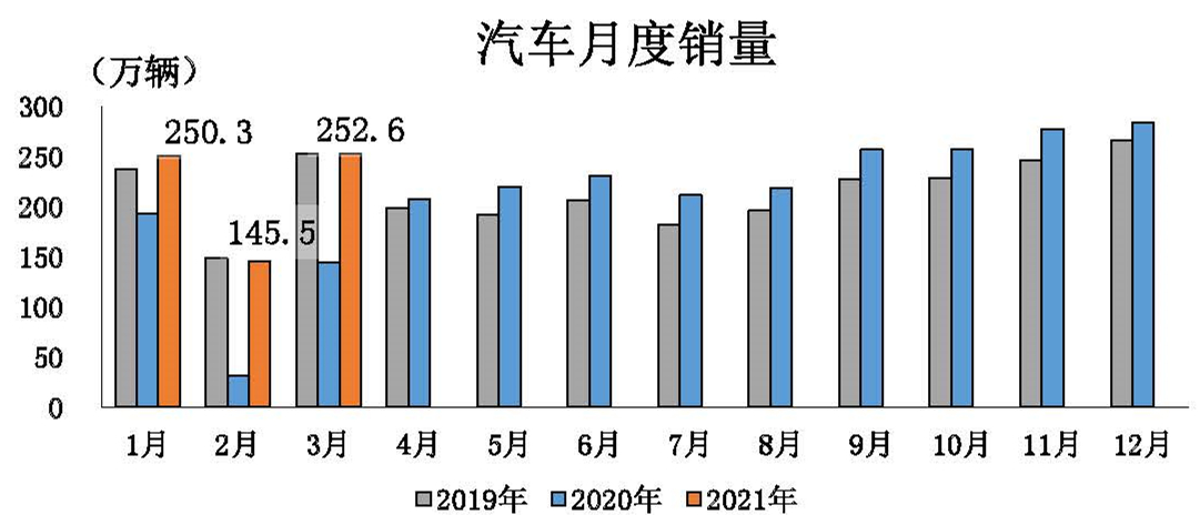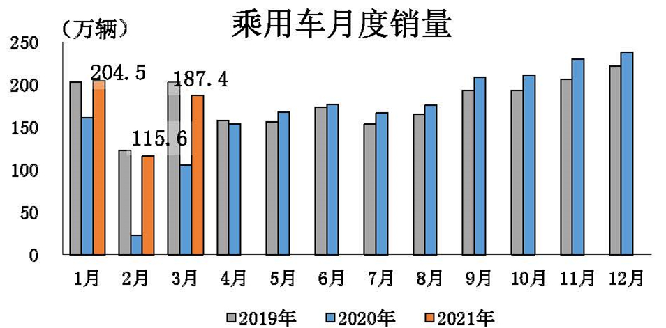 乘用車(chē)?yán)塾?jì)產(chǎn)銷(xiāo)較2019年同期降幅擴(kuò)大。 3月,乘用車(chē)產(chǎn)銷(xiāo)188.3萬(wàn)輛和187.4萬(wàn)輛,環(huán)比增長(zhǎng)62%和62.1%,同比增長(zhǎng)均為77.4%。1-3月,乘用車(chē)產(chǎn)銷(xiāo)495.5萬(wàn)輛和507.6萬(wàn)輛,同比增長(zhǎng)83.1%和75.1%。與2019年1-3月數(shù)據(jù)相比,乘用車(chē)產(chǎn)銷(xiāo)繼續(xù)呈現(xiàn)下降,同比下降5.2%和3.6%,降幅增幅比1-2月提高1.1個(gè)百分點(diǎn)。