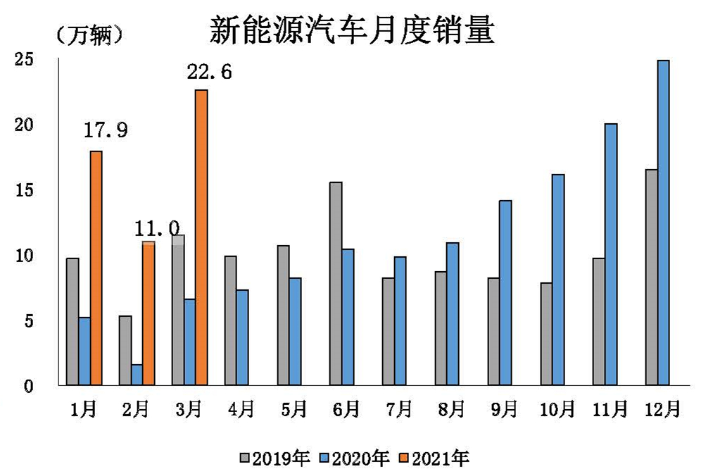 商用車(chē)產(chǎn)銷(xiāo)再創(chuàng)歷史新高。 3月,商用車(chē)產(chǎn)銷(xiāo)57.9萬(wàn)輛和65.1萬(wàn)輛,環(huán)比增長(zhǎng)70.2%和1.2倍,同比增長(zhǎng)55.2%和68.1%。1-3月,商用車(chē)產(chǎn)銷(xiāo)139.7萬(wàn)輛和140.8萬(wàn)輛,同比增長(zhǎng)76.9%和77.4%。商用車(chē)中,受?chē)?guó)六標(biāo)準(zhǔn)切換、治超治限、基建項(xiàng)目啟動(dòng)等因素拉動(dòng),重型貨車(chē)、輕型貨車(chē)再創(chuàng)產(chǎn)銷(xiāo)歷史新高,從而拉動(dòng)貨車(chē)和商用車(chē)共創(chuàng)產(chǎn)銷(xiāo)歷史新高。 新能源汽車(chē)?yán)^續(xù)刷新當(dāng)月歷史產(chǎn)銷(xiāo)記錄。 3月,新能源汽車(chē)產(chǎn)銷(xiāo)分別完成21.6萬(wàn)輛和22.6萬(wàn)輛,同比增長(zhǎng)2.5倍和2.4倍,繼續(xù)刷新當(dāng)月歷史產(chǎn)銷(xiāo)記錄。1-3月,新能源汽車(chē)產(chǎn)銷(xiāo)分別完成53.3萬(wàn)輛和51.5萬(wàn)輛,同比增長(zhǎng)3.2倍和2.8倍,與1-2月相比,增速有所減緩。